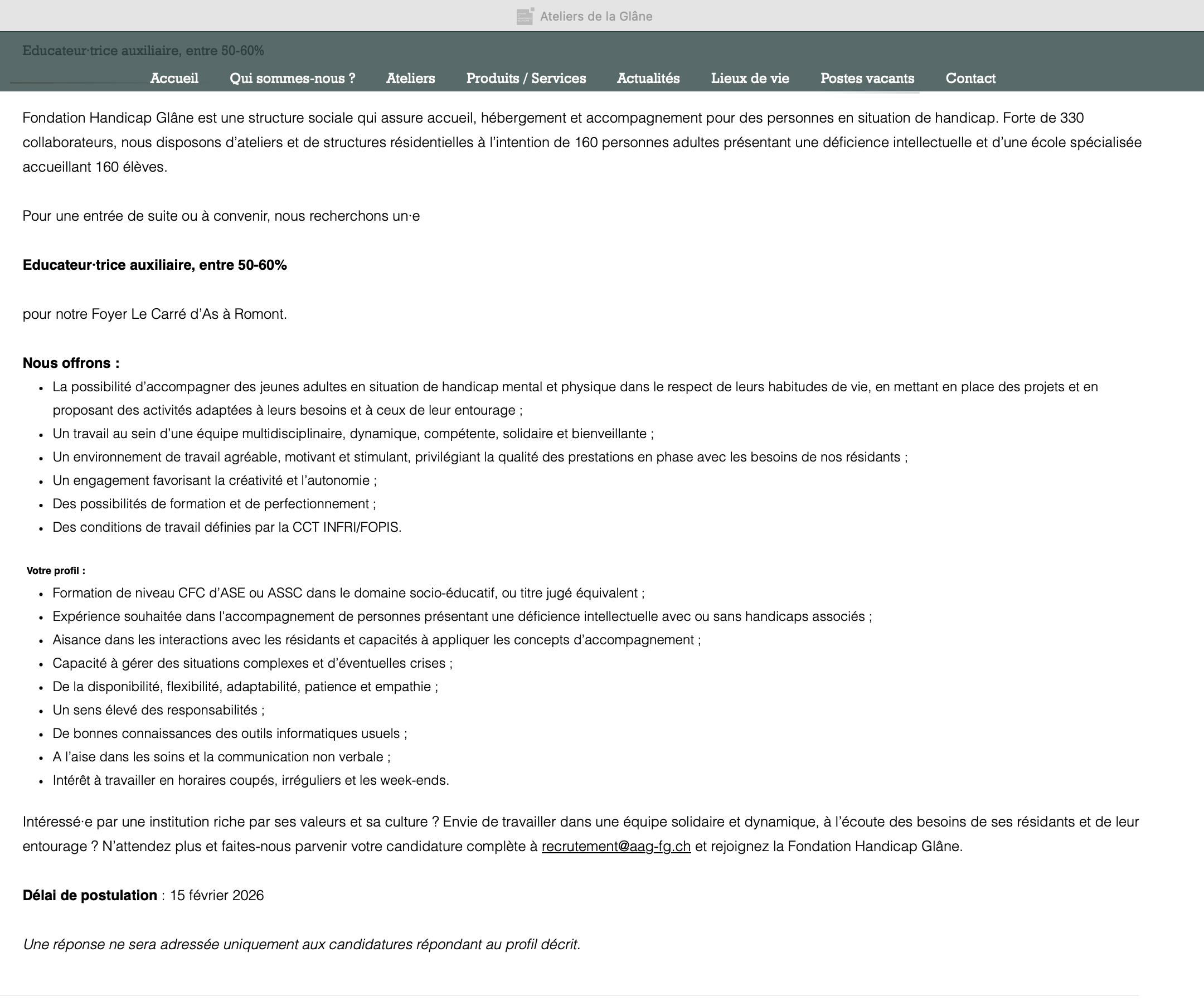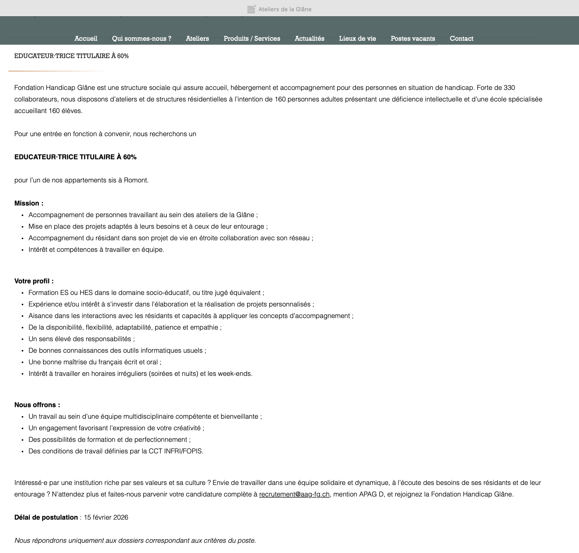 Fondation Handicap Glâne, appartement-Educateur/trice 60%